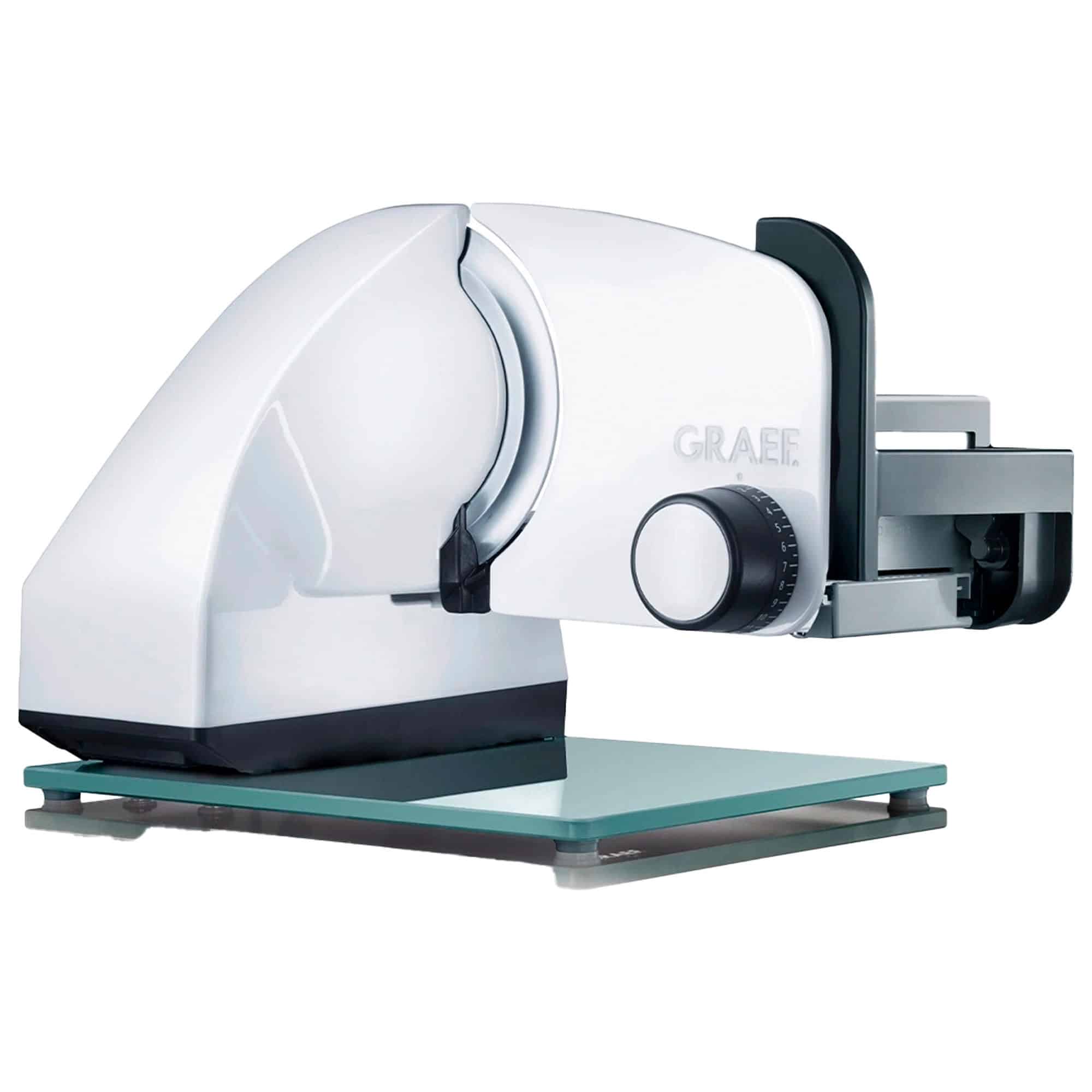 Den hvide pålægsmaskine M91EU fra Graef er en del af deres professionelle Master-serie og produceres i Tyskland, hvor kvalitet og præcision er i fokus. Graef er førende inden for skæremaskiner, og modellen hører til blandt de kraftigste og mest profession